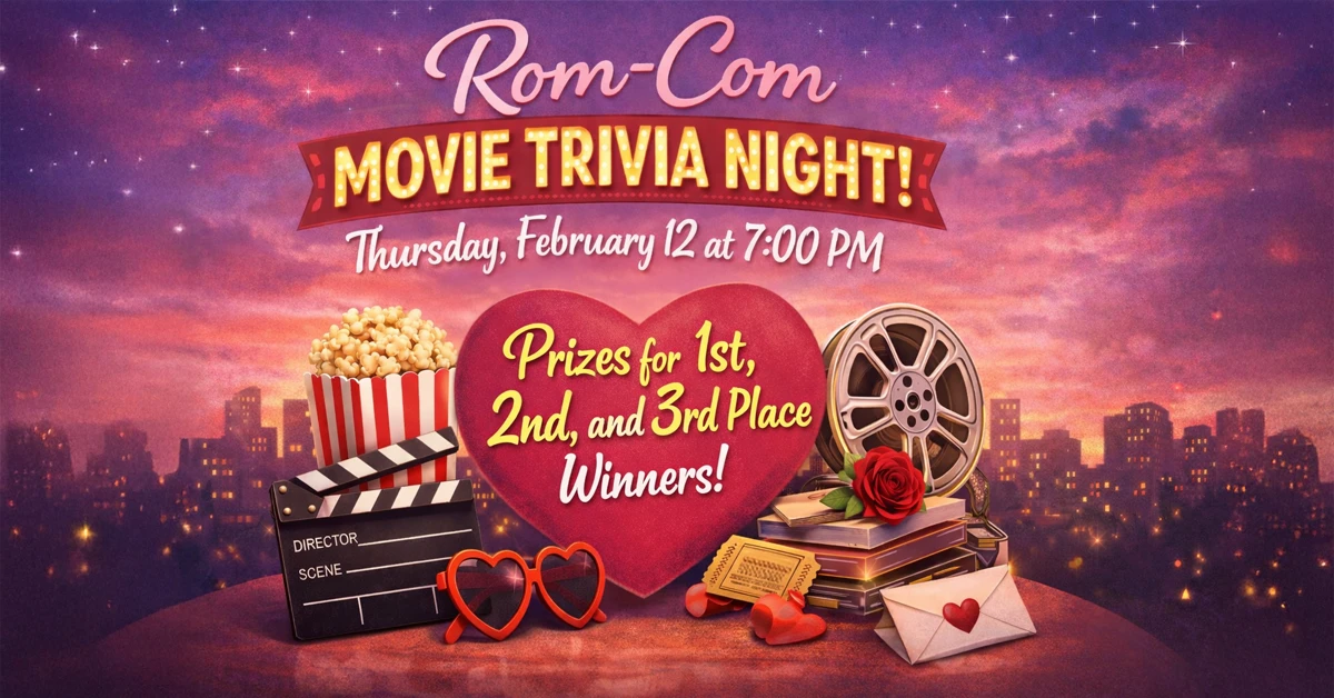 Thursday Feb 12th, grab your besties and put your rom-com knowledge to the test! Team sign-ups begin at 6:30 PM, and the game kicks off at 7:00 PM sharp.